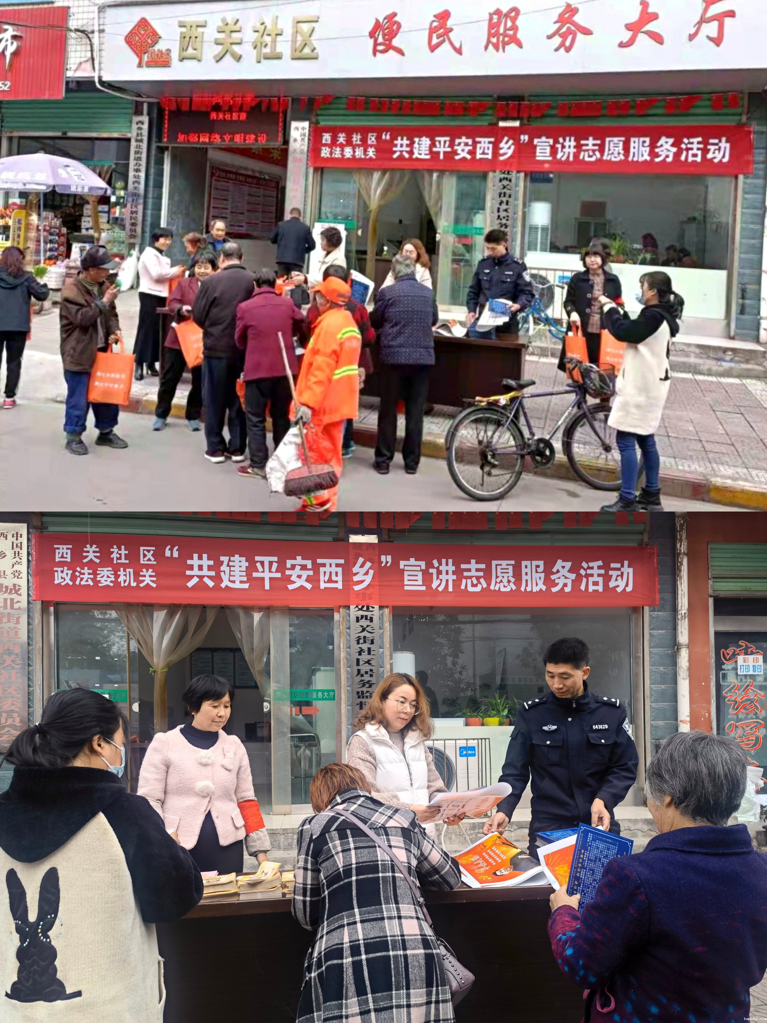 三是开展“共建平安西乡”宣讲志愿活动。在室内学习培训活动结束后,两个支部党员走向街头、小巷,向社区群众发放了平安建设宣传年画、安全防范知识手册、平安建设宣传折页、反邪教有奖举报宣传单和充电器、停车牌、纸杯、购物袋等平安宣传实物;并向群众宣传了社会治安防范、电信诈骗、安全防范、识邪防邪等平安知识,积极接受和答疑解惑群众提出的相关问题和法律咨询,认认真真为民服务办实事、解难题。