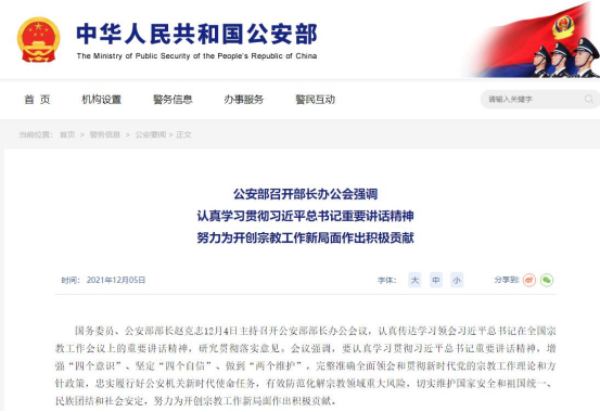 国务委员、公安部部长赵克志12月4日主持召开公安部部长办公会议,认真传达学习领会习近平总书记在全国宗教工作会议上的重要讲话精神,研究贯彻落实意见。会议强调,要认真学习贯彻习近平总书记重要讲话精神,增强“四个意识”、坚定“四个自信”、做到“两个维护”,完整准确全面领会和贯彻新时代党的宗教工作理论和方针政策,忠实履行好公安机关新时代使命任务,有效防范化解宗教领域重大风险,切实维护国家安全和祖国统一、民族团结和社会安定,努力为开创宗教工作新局面作出积极贡献。