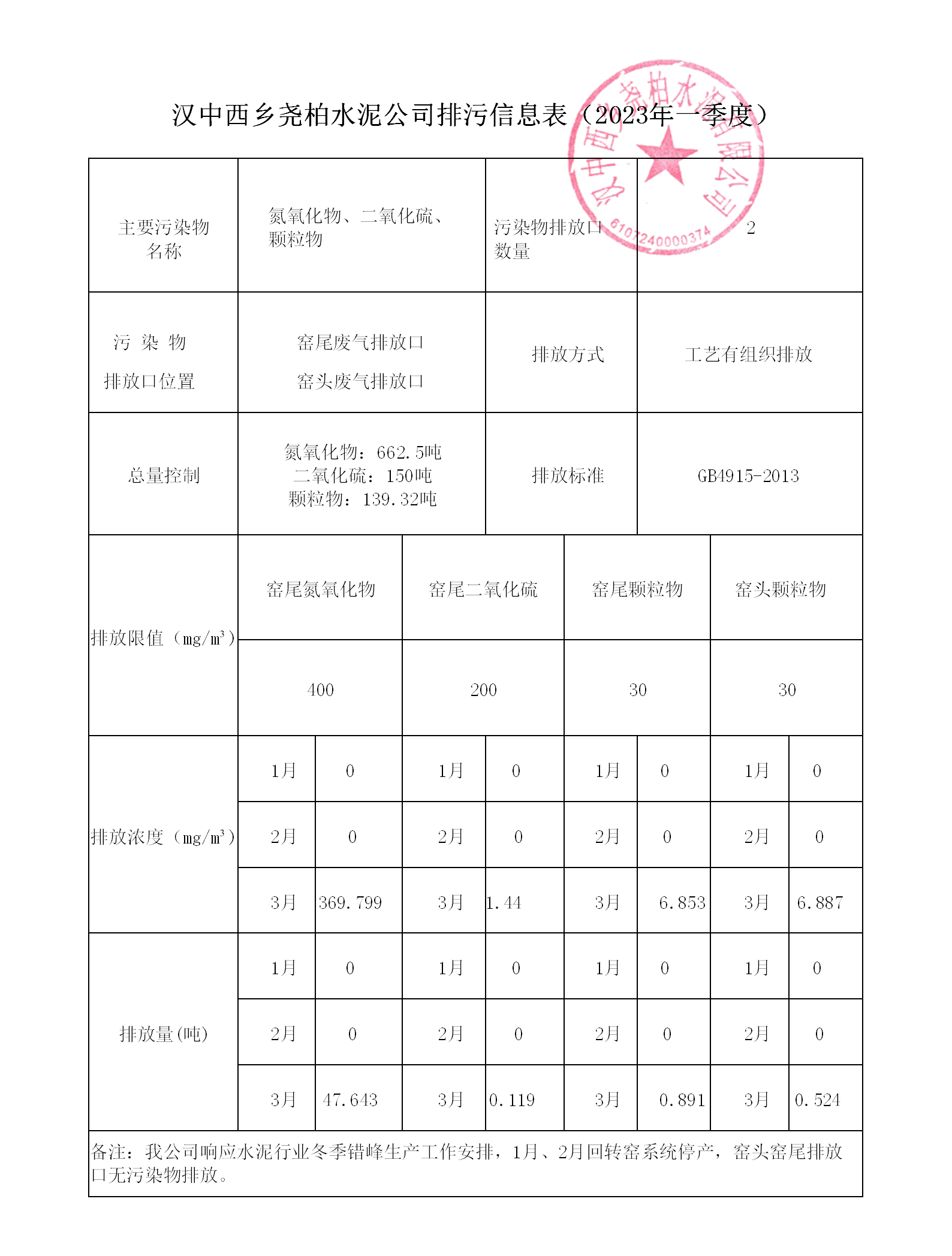 汉中西乡尧柏水泥公司排污信息表(2023第一季度)