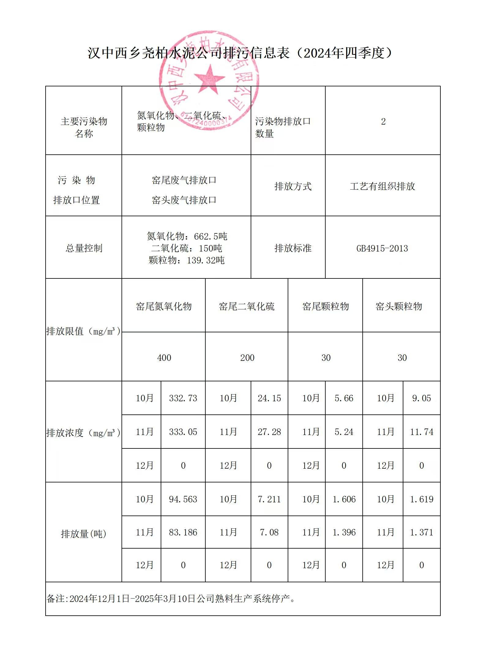 汉中西乡尧柏水泥公司排污信息表(2024年第四季度)