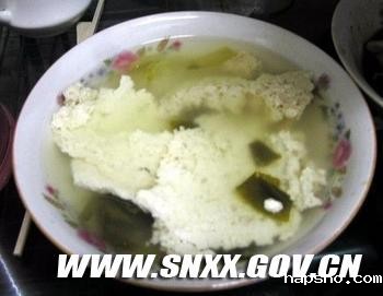 菜豆腐含有丰富的蛋白质、易于消化、清爽可口,是一种既经济又实惠的大众食品。菜豆腐制作与豆腐程序差不多。将大豆泡涨后磨成浆把渣过滤后,烧煮豆浆,煮开后泡沫上涨时,便用备好的浆水汤(或石膏水)往锅内倒,反复多次,豆浆变成豆花,待锅水清后,豆花汇合成嫩白豆腐,即可备用。然后再煮大米稀饭,待米半熟后,把豆腐倒在一起煮,再加点浆水菜、小白菜就行了。这种食品要配上豆瓣酱或青辣椒加一些香菜、韭菜、味精、醋、酱油拌匀即可。这种饮食是夏天消暑之佳品。